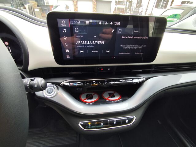 6 Lautsprecher, Ambiente-Beleuchtung, Armaturenbrett farbig, Autom. Begleitfunktion der Beleuchtung (Follow me home), Auenspiegel Wagenfarbe, Elektromotor 87 kW (cont. 43 kW), Fahrassistenz-System: Aufmerksamkeits-Assistent, Fahrassistenz-System: Autonomer Notbrems-Assistent (AEB), Fahrassistenz-System: Spurhalteassistent, Fahrassistenz-System: Verkehrszeichenerkennung, Fahrmodusschalter, Getriebe fr Elektrofahrzeug, Heckleuchten LED, Heckscheibe heizbar, HV-Batterie 42 kWh (Lithium-Ionen), Infotainment-System: UConnect mit DAB+ Radioempfang (Touchscreen 10, 25), Instrumentenanzeige Farbdisplay, 7 Zoll, Karosserie: 2-trig, Keyless-Entry & Go, Kopfsttzen hinten, Ladekabel mit Typ 2-Stecker (Mode 3), Lenkrad (Soft Touch) mit Multifunktion, Lenksule (Lenkrad) hhenverstellbar, Memoryfunktion fr Sitz vorn links, Mobile Online Dienste UConnect Live, Notrufsystem (eCall), One Pedal Drive (elektronisches Gaspedal), Parkbremse elektrisch, Radioempfang digital (DAB+), Regen-Lichtsensor, Schnellladefunktion 85 kW (DC), Seitenschutzleisten schwarz glnzend, Sitzbezug Polsterung: Stoff, Sitzverstellung vorn links (4-fach), Sitzverstellung vorn rechts (4-fach), Smartphone Schnittstelle (Apple CarPlay & Android Auto), Sonnenblenden mit Spiegel (beleuchtet), Steckdose (12V-Anschlu) vorn, Uni-Lackierung, USB-Schnittstelle, Verdeckbezug Stoff schwarz, Wrmeschutzverglasung,